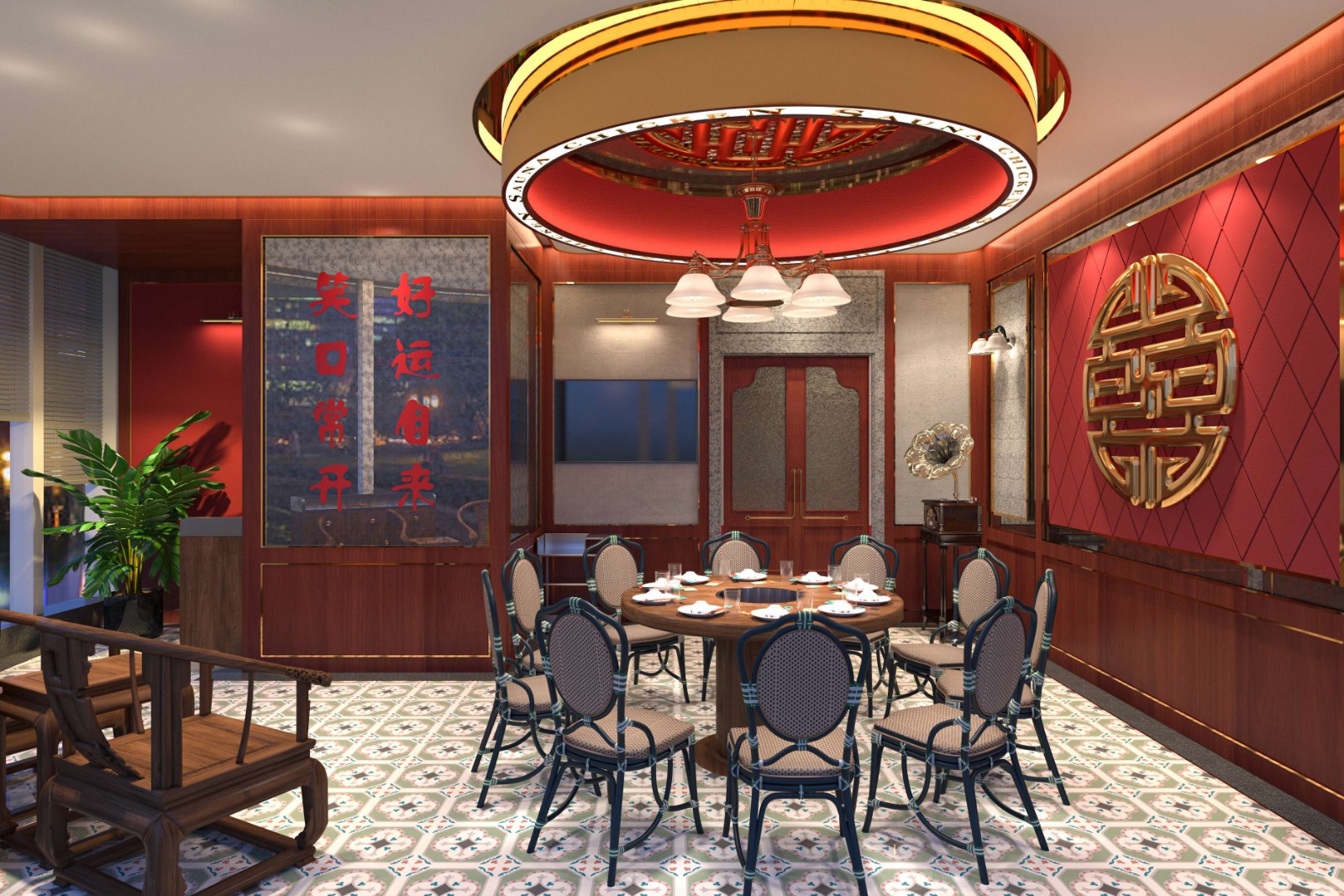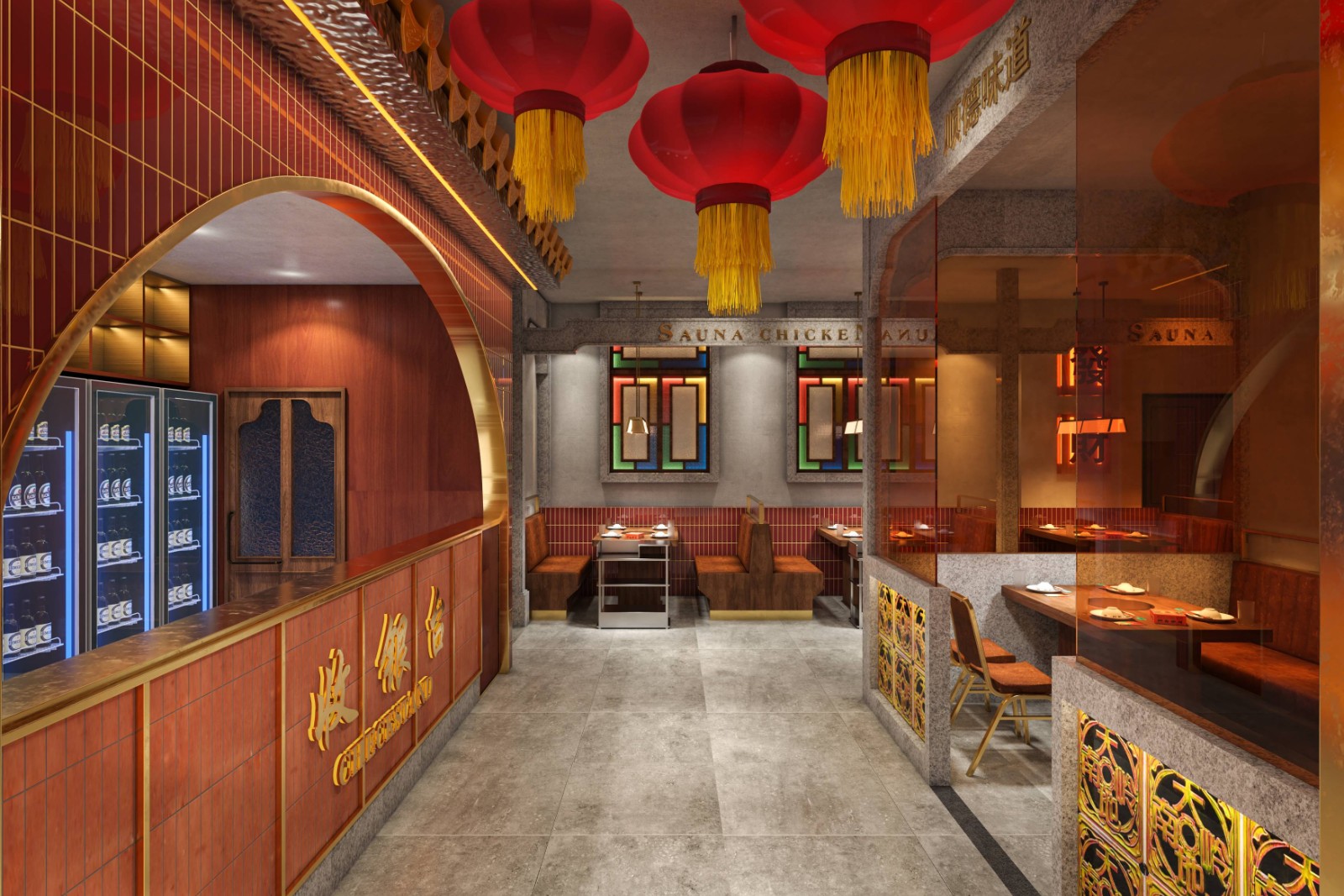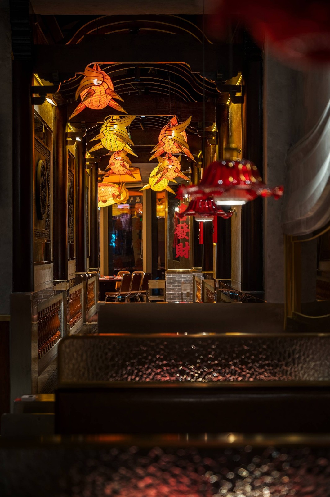 【空间设计】我们把整个空间的分为五个部分,门头 前厅 廊道 大厅 包间 用一个动线把空间连起来,做个渐进式的空间呈现,把设计重心放在位于中轴的大厅里面。先由一个小的空间场景慢触发我们的感官视觉。入口的双色水晶挂帘一下把消费者的感受带入老广文化里,随后墙面上的镬耳屋轮廓造型用不锈钢与传统材料结合,形成鲜明的视觉冲突。大厅用复古红色水磨石把大厅的空间尺度感和层次感表现出来。开阔的现代落地玻璃给了场地很好的自然条件,顶面吊的鱼灯波光粼粼的锡箔纸犹如鱼在水里游动的感觉,让空间有一些生机。