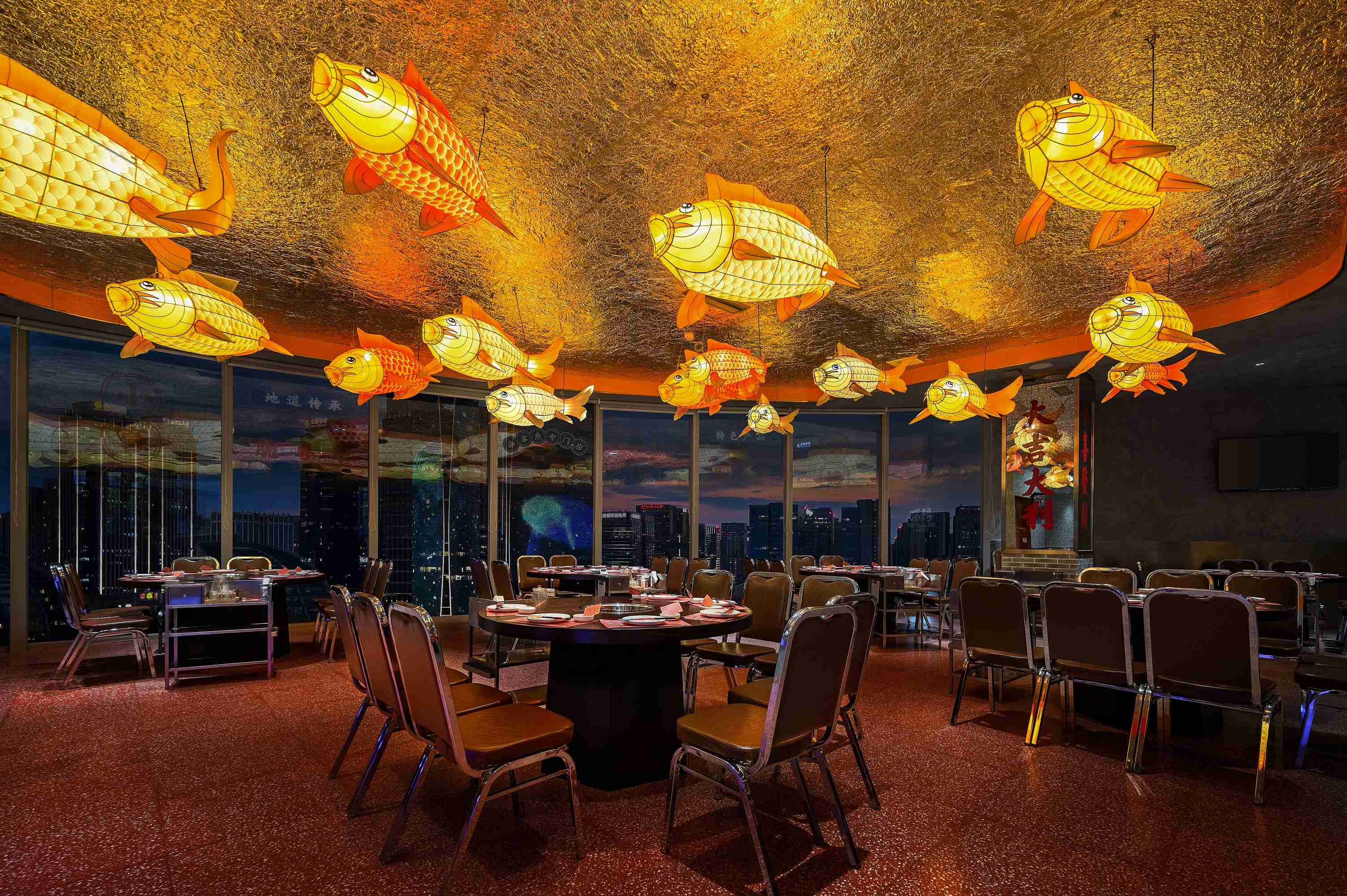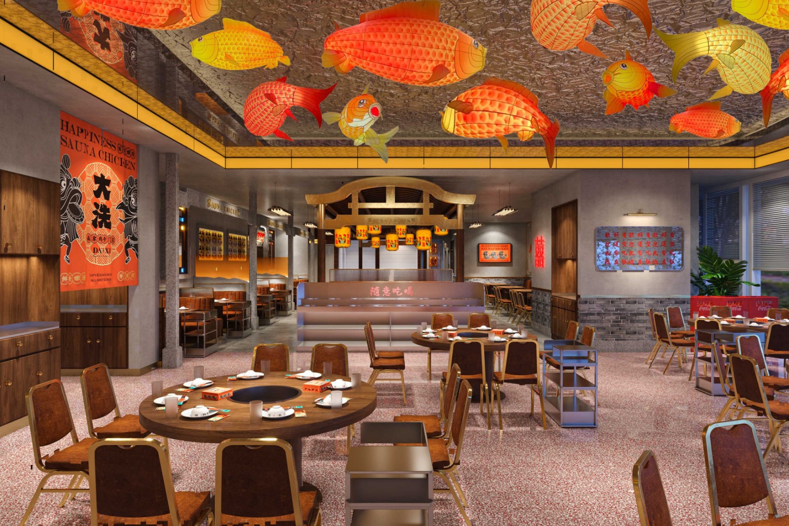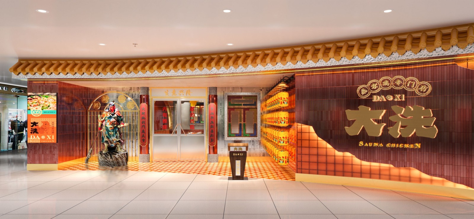 【空间设计】我们把整个空间的分为五个部分,门头 前厅 廊道 大厅 包间 用一个动线把空间连起来,做个渐进式的空间呈现,把设计重心放在位于中轴的大厅里面。先由一个小的空间场景慢触发我们的感官视觉。入口的双色水晶挂帘一下把消费者的感受带入老广文化里,随后墙面上的镬耳屋轮廓造型用不锈钢与传统材料结合,形成鲜明的视觉冲突。大厅用复古红色水磨石把大厅的空间尺度感和层次感表现出来。开阔的现代落地玻璃给了场地很好的自然条件,顶面吊的鱼灯波光粼粼的锡箔纸犹如鱼在水里游动的感觉,让空间有一些生机。