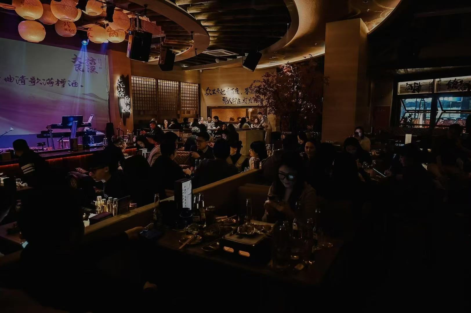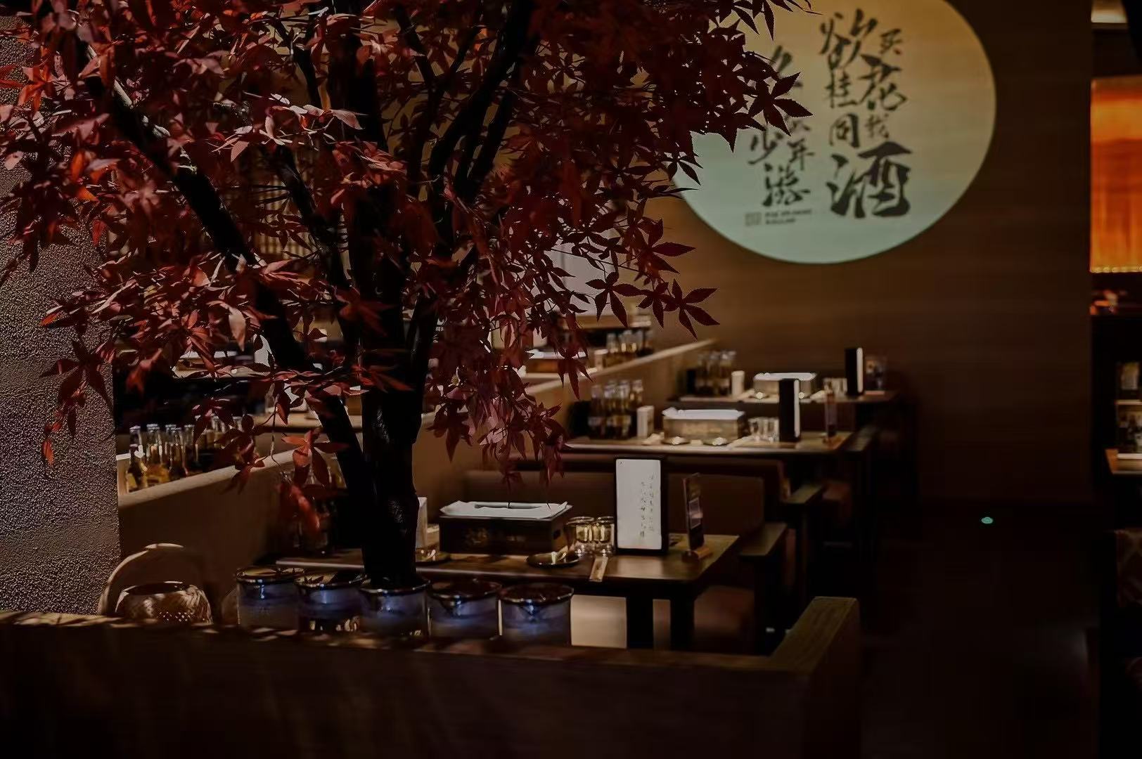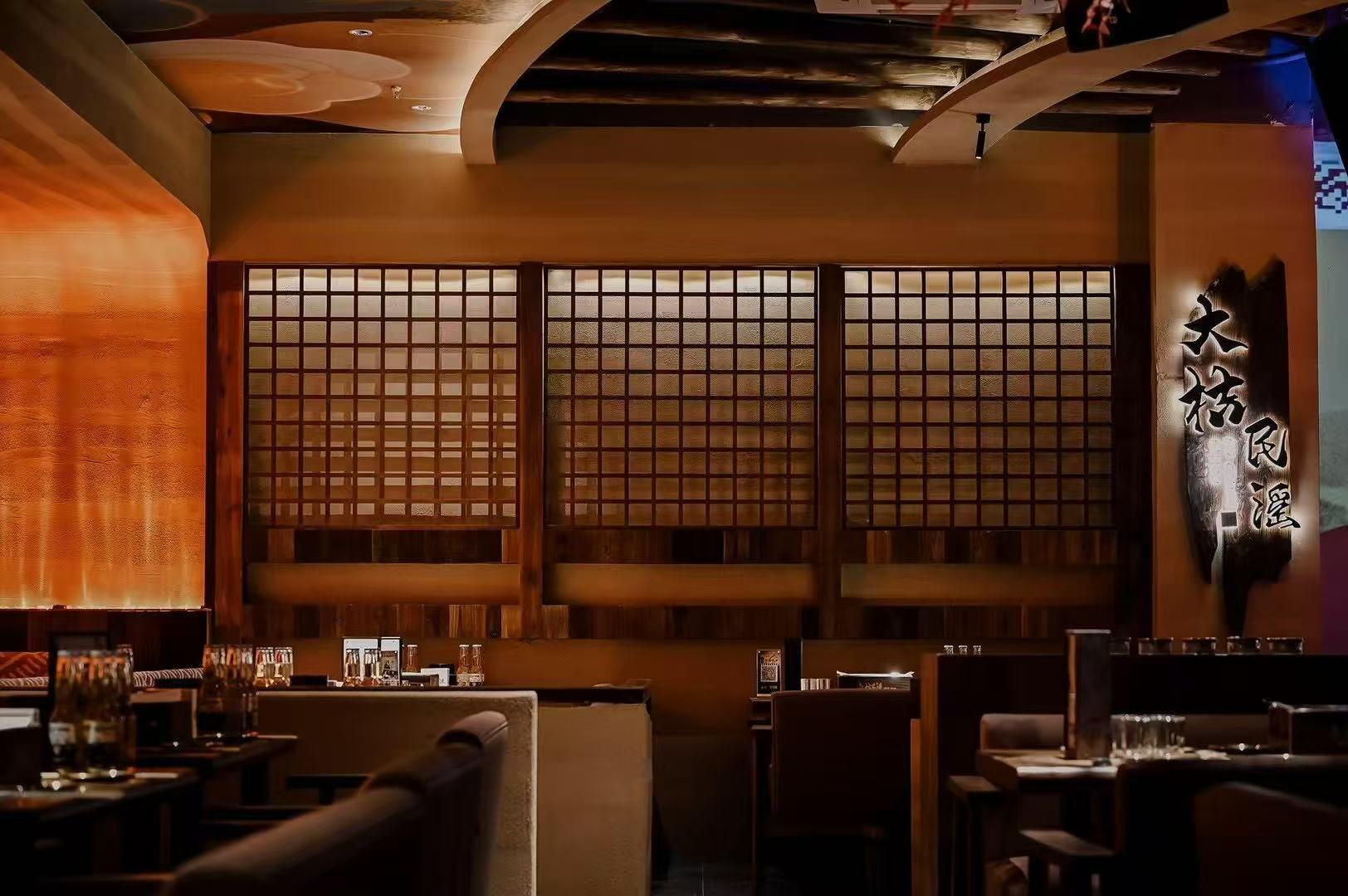 店铺整体是浓郁的中式古风氛围,融合传统元素与现代餐饮空间需求,给顾客带来独特且沉浸式的消费体验。全局木质材料的使用,墙面的书法挂画情,绿植装饰让昏暗的空间更有生机活力,暖色灯光听着民谣,吃着烤串,喝着小酒,绪价值设计的直观表达