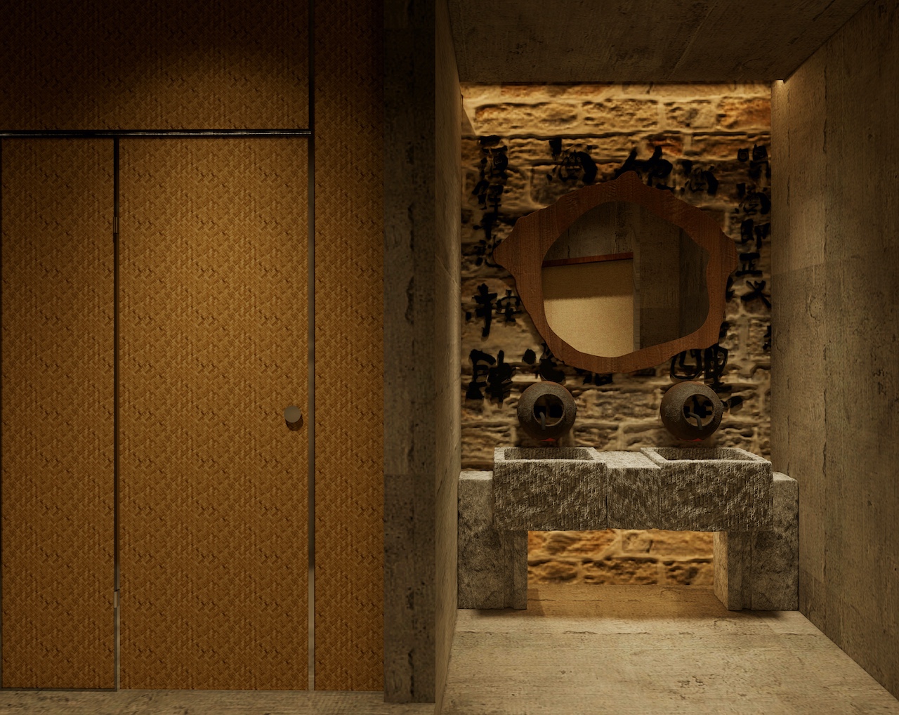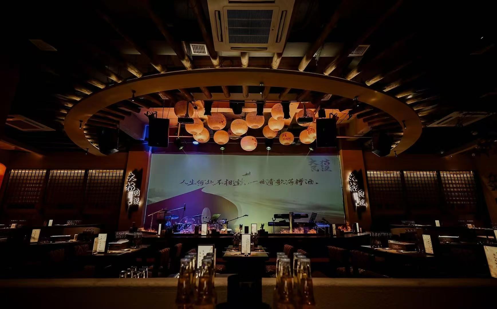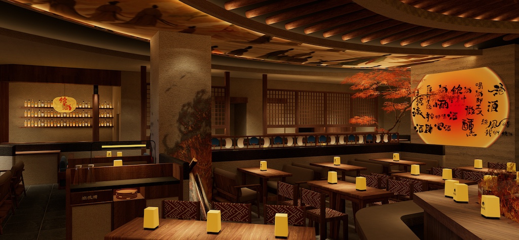 店铺整体是浓郁的中式古风氛围,融合传统元素与现代餐饮空间需求,给顾客带来独特且沉浸式的消费体验。全局木质材料的使用,墙面的书法挂画情,绿植装饰让昏暗的空间更有生机活力,暖色灯光听着民谣,吃着烤串,喝着小酒,绪价值设计的直观表达